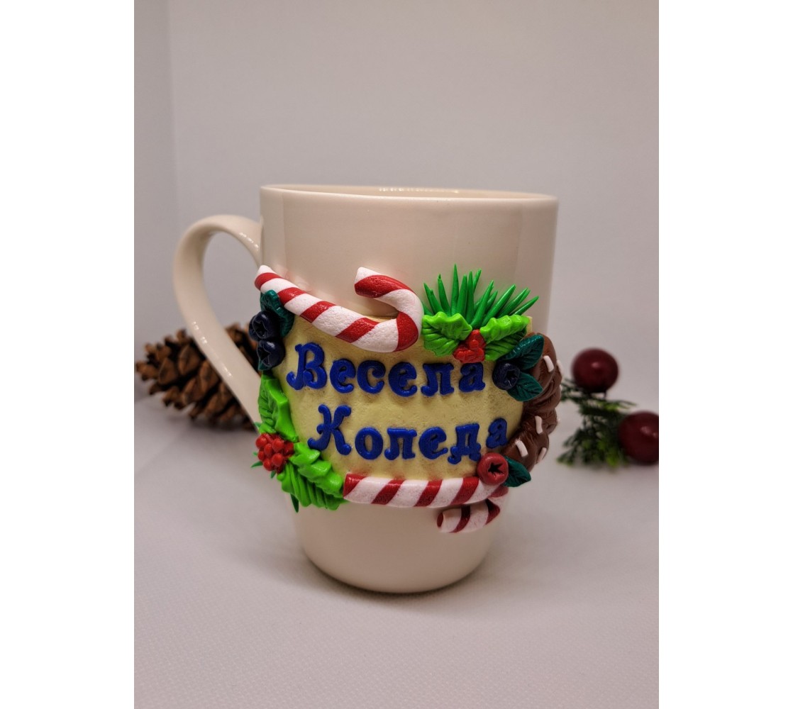 Ръчно декорирана порцеланова чаша за кафе или чай. Декорацията е изработена от полимерна глина и е на коледна тематика. Чашата е подходяща за подарък по повод предстоящите Коледни и Новогодишни празници!