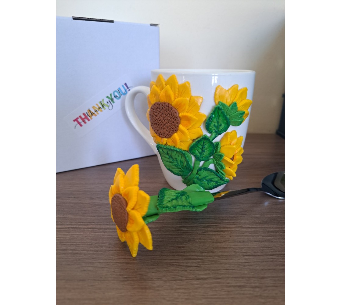 Интересен подаръчен комплект, състоящ се от чаена чаша и лъжичка с декорация от слънчогледи. Ръчно декорираните чаши са прекрасна идея за подарък по повод рожден ден, имен ден, но също така с тях може да зарадвате близък човек, който харесва слънчогледи.