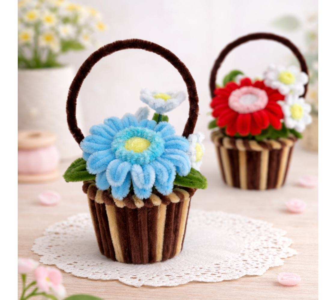 Тази ръчно изработена кошница с цветя е създадена от мека декоративна тел и оформена изцяло на ръка с внимание към всеки детайл. Цветята са обемни, нежни и устойчиви, а кошничката с дръжка придава завършен и елегантен вид. Приблизителен размери: 18 см. височина/ 12 см. ширина