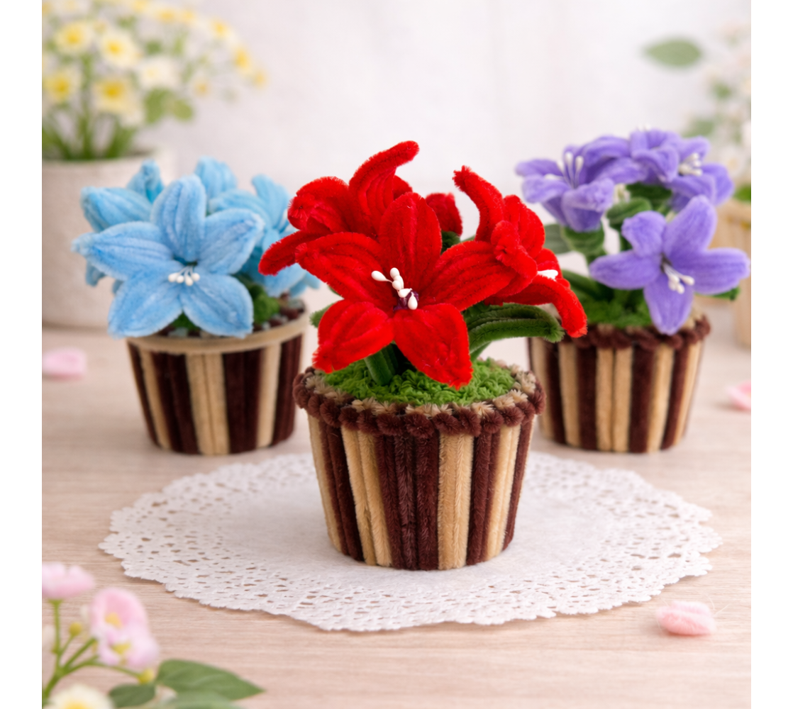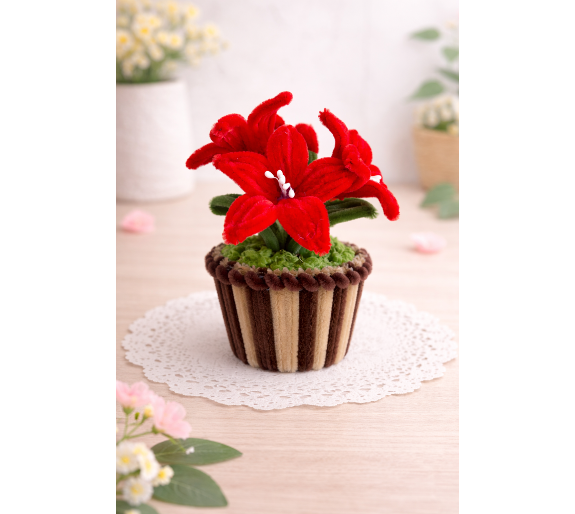 „Нежен Лилиум“ е ръчно изработено декоративно цвете от мека декоративна тел, оформено с внимание към фините детайли и естествената форма на лилиума. Наситените или пастелни цветове придават изразителност, а компактната ръчно изработена саксия завършва композицията с усещане за стил и уют. Приблизирелни размери: 18 см. височина/ 12 см. ширина